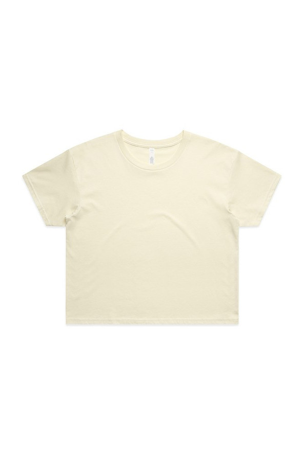 - Short body, dropped shoulders, neck ribbing, side seamed, shoulder to shoulder tape, double needle hems