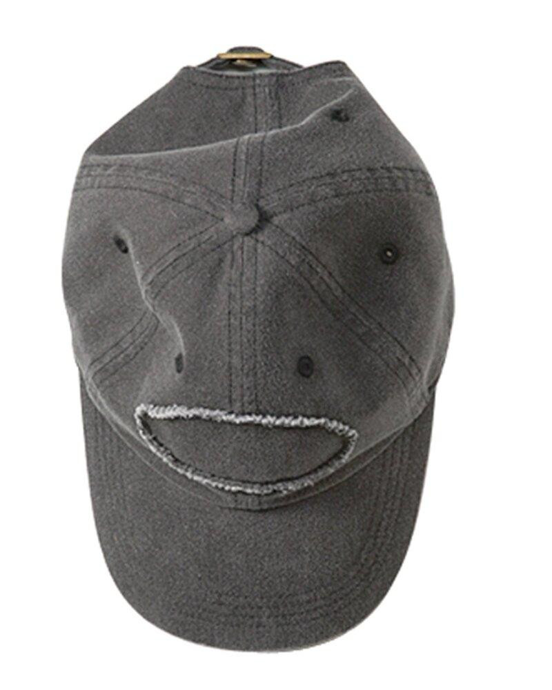 100% washed cotton twill; 6-panel, unstructured ; 4" x 2" patch; distressed brim; embroidered eyelets; self-fabric closure with antique brass slider and tuck-in strap;