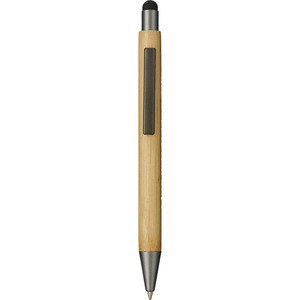 The Bamboo Ballpoint Stylus features a 100% bamboo barrel with gunmetal accents. Soft, rubberized capacitive touch stylus. Equipped with ultra-smooth, quick dry semi-gel black ink cartridge. Click action mechanism. Pen tip is 1 mm. Writing length is 800m. Laser finish will have light to dark brown wood burned appearance.