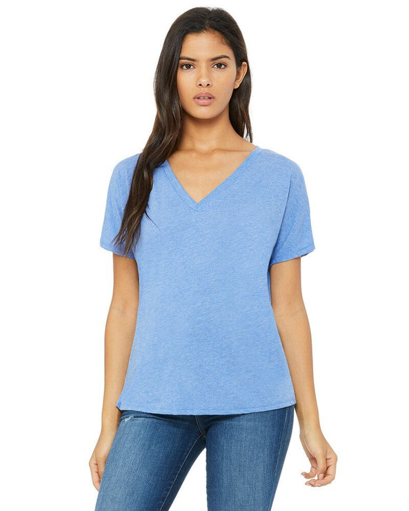 Comfort is key in this Ladies' Flowy V-Neck Drop-Sleeve Tee from Bella+Canvas. Made with all the details you love in a classic v-neck, this t-shirt has an added relaxed, slouchy fit to give your style that little extra something. This coveted tee is made from 65% viscose polyester and 35% cotton with 30 singles for extreme softness (Athletic Heather is 52% polyester, 48% viscose; Triblends are 50% polyester, 25% cotton, 25% rayon, 40 singles; Marbles are 91% polyester, 9% cotton, 40 singles). Perfect for everyday wear, including at the gym or to yoga class. Additional features you’ll enjoy include drop sleeves, a subtle curved bottom hem, side seams, longer body length, and superior screen printing quality. This model comes in 15 elegant colours in sizes S through 2XL.