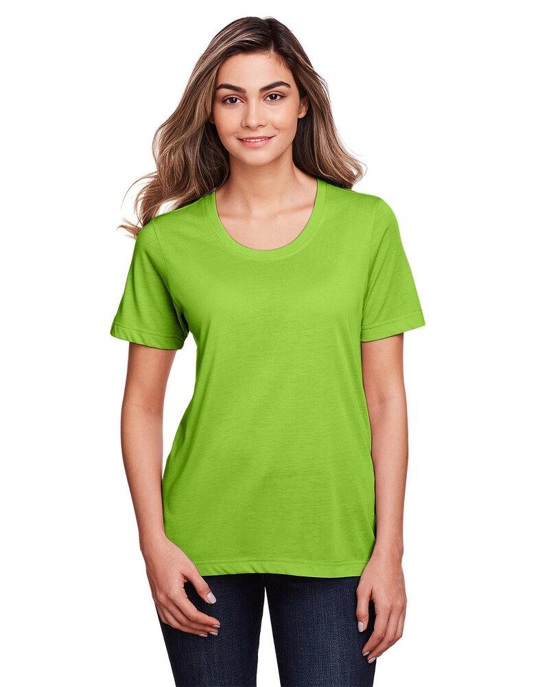 4.5 oz/yd2 / 160 gsm, 100% polyester jersey; ChromaSoft technology combines the colorfastness of cationic dyes with; soft cotton-feel performance; Moisture-wicking and antimicrobial performance; Tear away main label; Fashion forward scoop feminine neckline; Active fit; Easy care