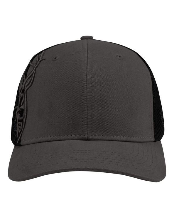 - Charcoal & Saddle with a mesh back color are 100% brushed cotton twill fronts panels and bill/100% polyester, soft trucker