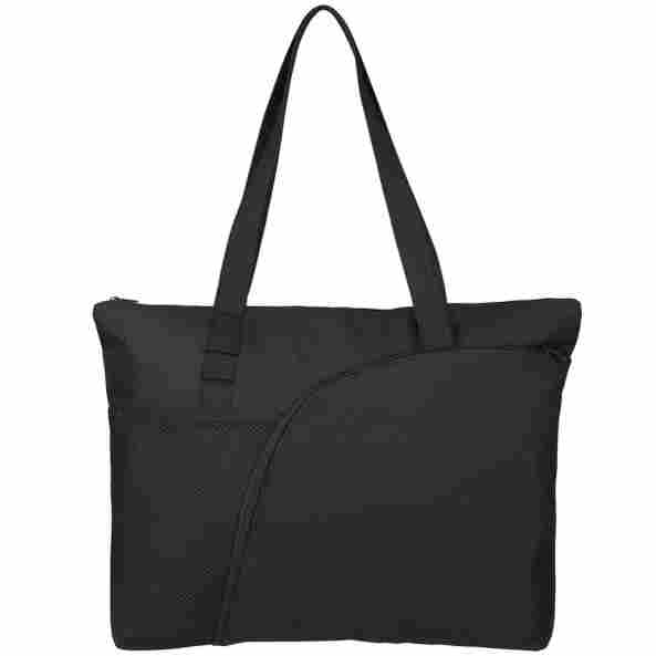 Great for tradeshows, conventions, and business meetings. Zippered main compartment. Zippered front pocket. Front mesh pocket. Pen loops. Rear ID window. Open back pocket. 12" handle drop height.