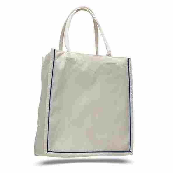 6 oz. 100% cotton. Fancy web handles. Full side and bottom gusset.