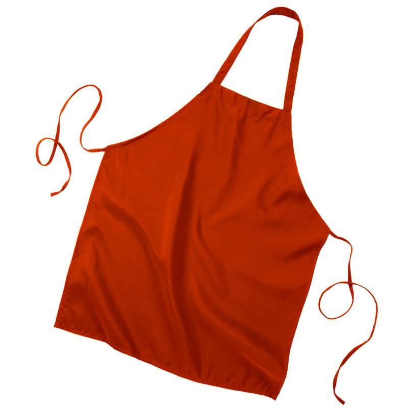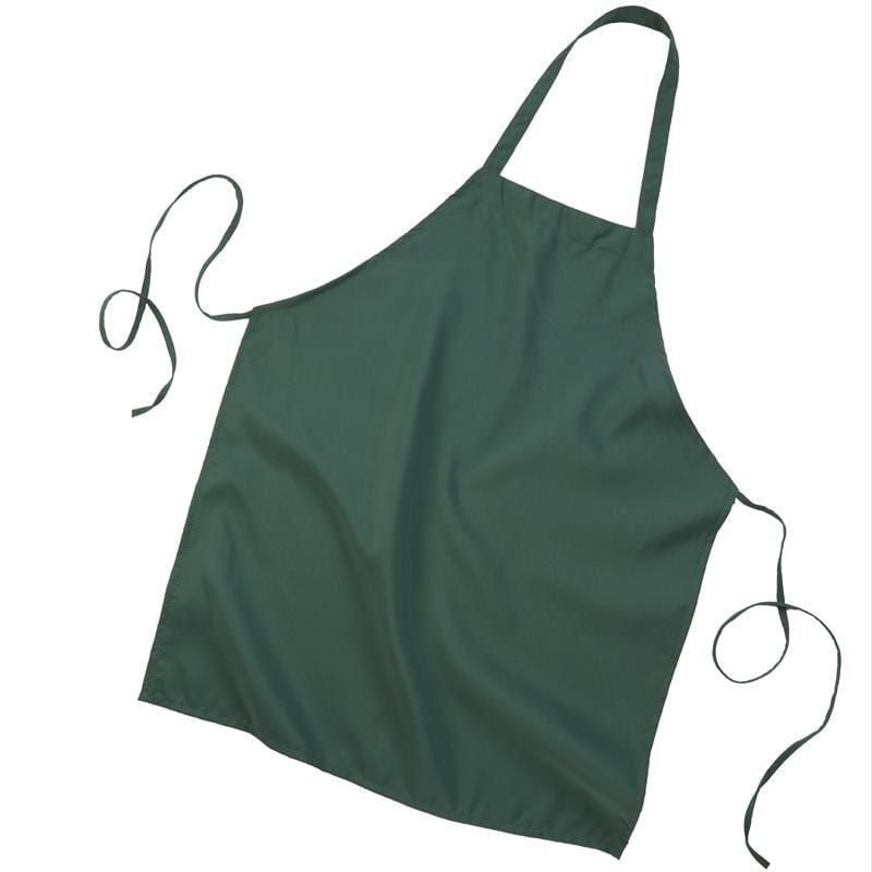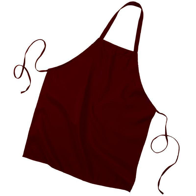 Bib Apron no pocket, 100% Brushed Filament Polyester, 36" matching fabric ties, Excellent color retention and wrinkle resistance, Bar tacked ties for added durability.