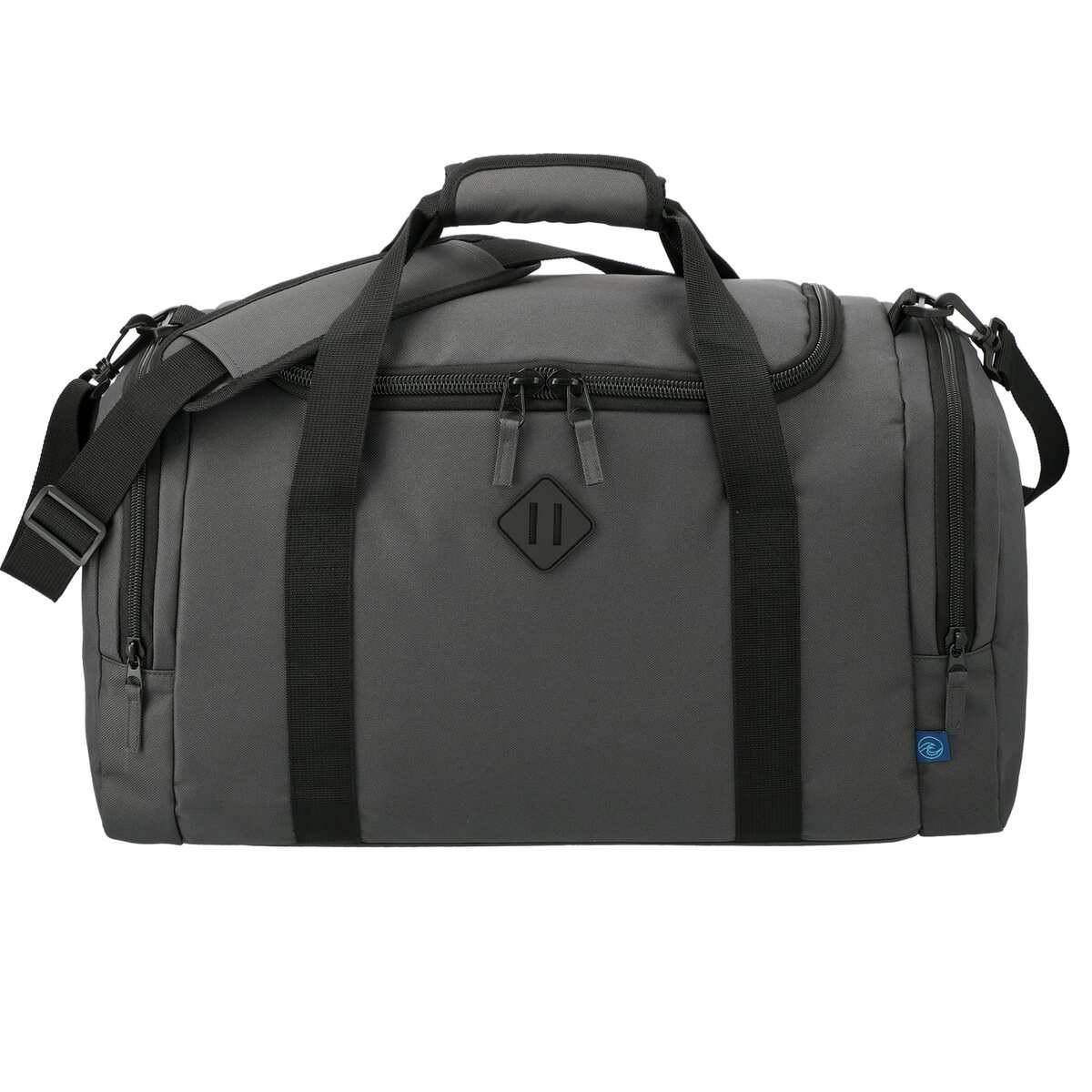 Saving the ocean one bag at a time! The Repreve® Ocean Duffel is made from recycled ocean plastic. This duffel features a roomy zippered main compartment, as well as two zippered side pockets for items like your shoes or accessories. Carry using the removeable, padded, adjustable shoulder strap or the carry grab handles. Through a partnership with 1% For The Planet one percent of sales of this and all EcoSmart products will be donated to nonprofits dedicated to protecting the planet.